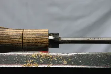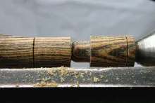 Sand to at least 800 grit and use the parting tool to detach both barrels at the sizing grooves, starting with the top barrel. Finish the barrel opening by hand using the side scraper, the inner wall of the barrel using sand paper and the bottom of the hole in the lower barrel using epoxy (a thin layer of epoxy will ensure a completely smooth bottom). Treat the whole stacker (inside and out) with boiled linseed oil.